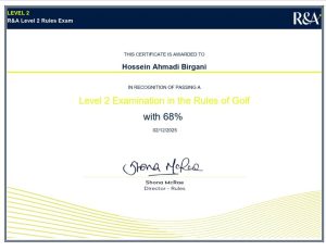 به گزارش روابط عمومی فدراسیون گلف، حسین احمدی مارشال سوپر لیگ فدراسیون گلف با حضور در دوره 2 روزه داوری درجه 2 گلف که توسط انجمن گلف کشور مالزی برگزار شد، شرکت کرد و بعد از حضور موفق در آزمون رسمی برگزار شده توسط R&A(The Royal and Ancinent golf club یکی از معتبرترین مراجع قانونگذاری گلف در جهان) موفق به دریافت گواهینامه بینالمللی شد.